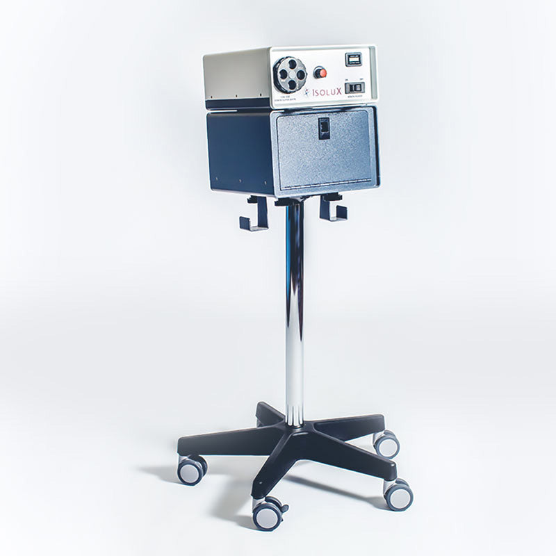 The Xenon Fiber Optic Surgical Light Source uses a 300-Watt Lamp that enables the illuminator to achieve a high-intensity, full-spectrum natural light. The Model 1300 XSB 300-Watt Xenon Fiber Optic Light Source is intended to be used with fiber optic cables and surgical headlights. Available with mobile stand only or stand with storage box