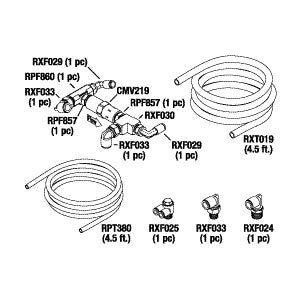 Includes: (4.5 ft.) Tubing (.170" ID x 1/4" OD Natural) (Part #RPT380), (4.5 ft.) Tubing (.275" ID x .375" OD Natural) (Part #RXT019), (3 pcs) Elbow Fitting (3/8" Push-In x 1/4" MPT) (Part #RXF033), (1 pc) Branch Elbow (Dual 1/4" Push-In x 1/4" MPT) (Part #RXF025), (2 pcs) Elbow Fitting (1/4" Push-In x 1/4" MPT) (Part #RXF029), (1 pc) Street Tee (1/4" NPT) (Part #RXF030), (1 pc) Male Branch Tee (Part #RPF860), (2 pcs) Adaptor (1/4" FPT x 3/8" MPT) (Part #RPF857), (1 pc) Elbow (3/8" Push-In x 3/8" MPT) (Part #RXF024), (1 pc) Check Valve (Part #CMV219)